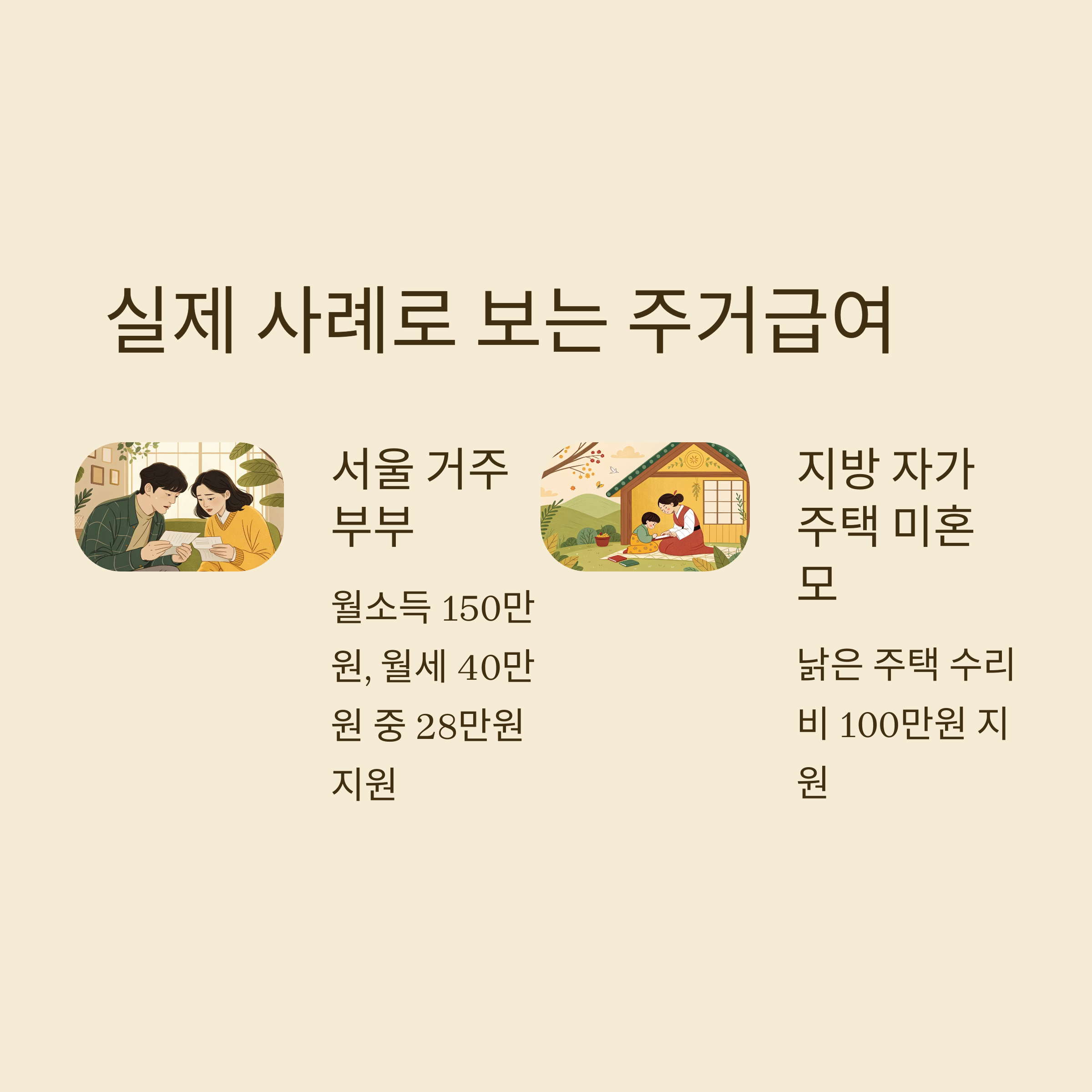 | 사례 1 | 부부 (2인) | 월세, 서울 | 임차급여 약 28만 원/월 |