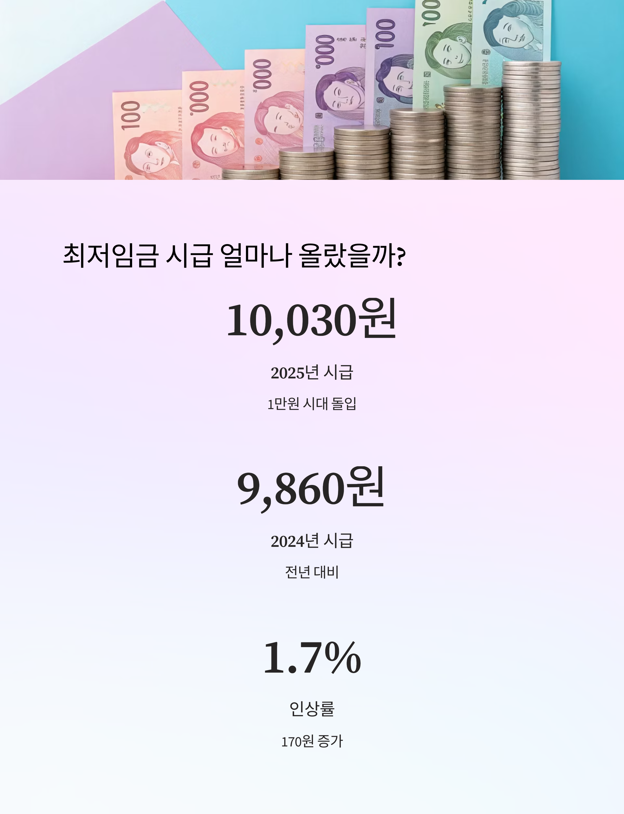 2025년 최저임금은 1시간 기준 10,030원으로 결정됐어요. 이는 전년도인 2024년의 9,860원보다 170원 오른 금액으로, 인상률은 1.7%에 해당돼요. 단순히 숫자만 보면 적은 인상처럼 느껴질 수 있지만, 중요한 상징적 의미를 가진 변화예요.