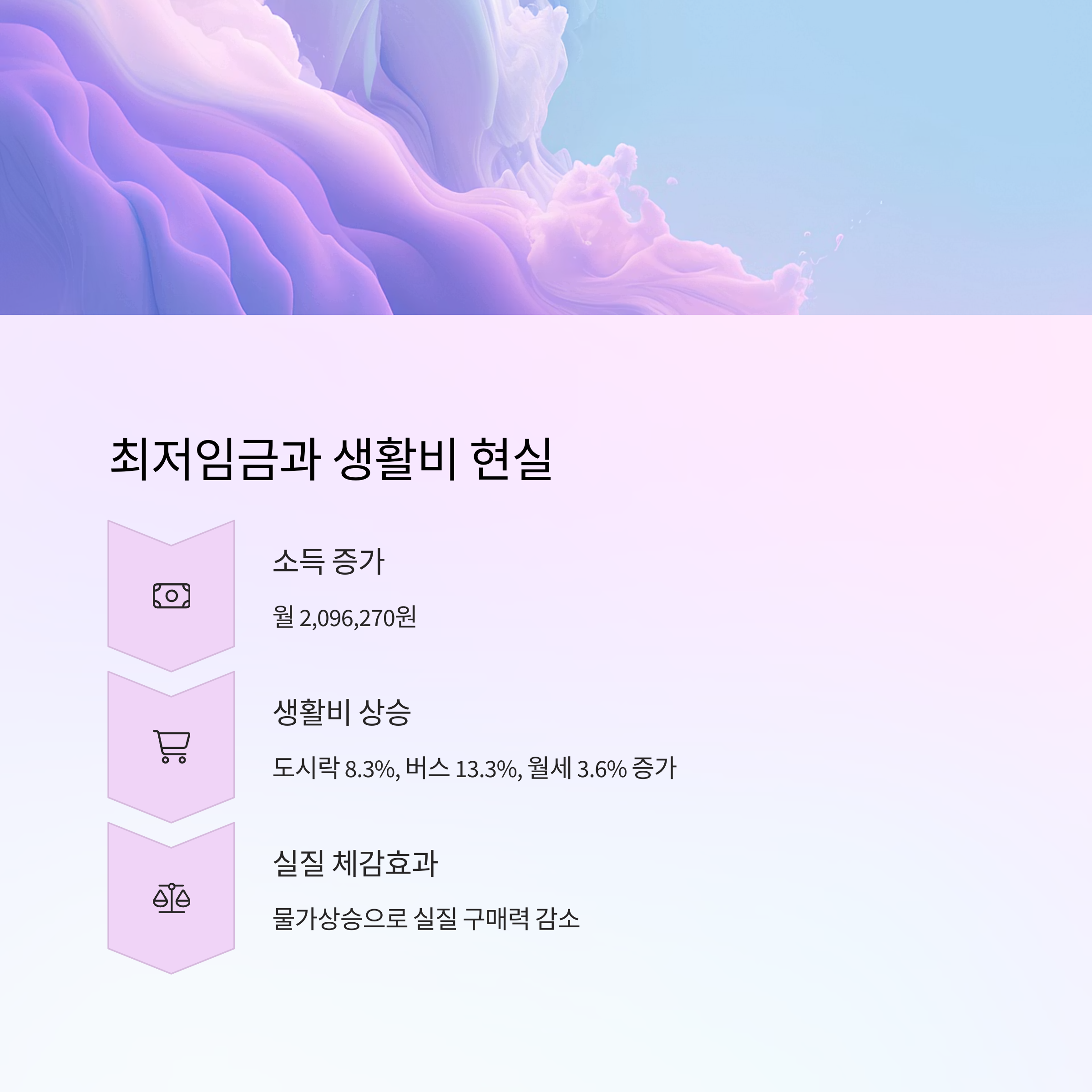 이처럼 소득이 늘어도 생활비가 함께 오르면 실질적 이익이 크지 않다는 현실적인 문제가 있어요. 그럼에도 불구하고 최저임금 인상은 저소득층의 기본 생계를 위한 최소한의 장치라는 점에서 중요성이 높아요.