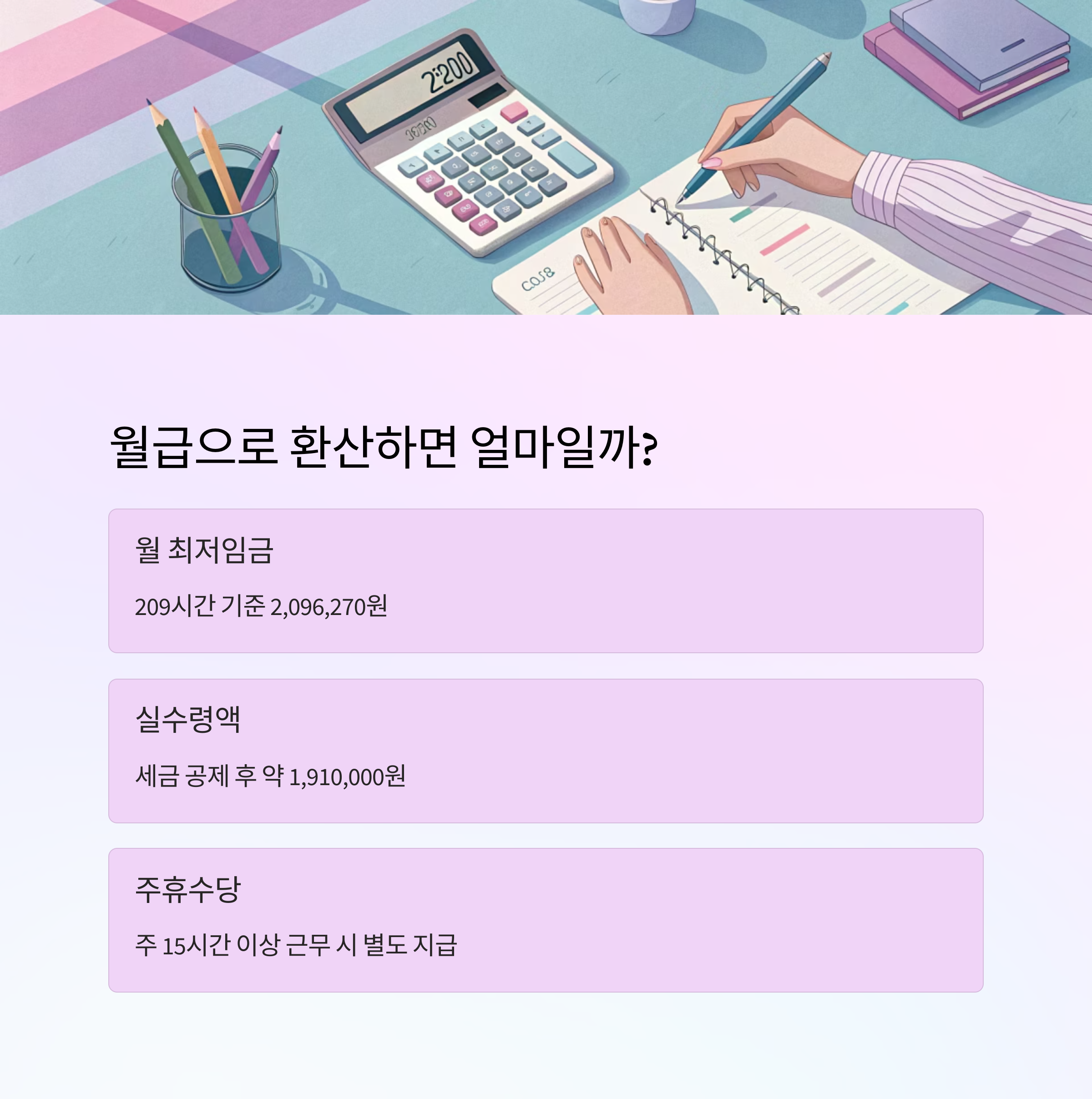 2025년의 월 최저임금은 209시간 기준으로 2,096,270원이 돼요. 이 수치는 기본적으로 주 40시간, 월 평균 4.345주를 기준으로 계산된 거예요. 여기에는 주휴수당이 포함된 금액이기 때문에 실제 시급만 곱했을 때보다 더 많게 느껴질 수 있어요.